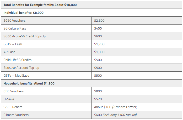 综合所有2025年预算案措施,这个示例家庭在2025财年预计可获得总计约10,800新元的福利,其中约8,900新元为个人福利,约1,900新元为家庭共享福利: