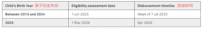 每名12岁及以下儿童可获得500新元Child LifeSG 补助金,该补助金将通过LifeSG应用程序发放。儿童生活SG补助金发放时间表如下: