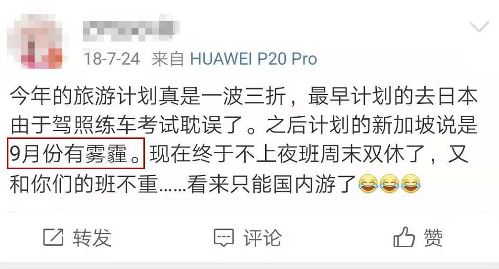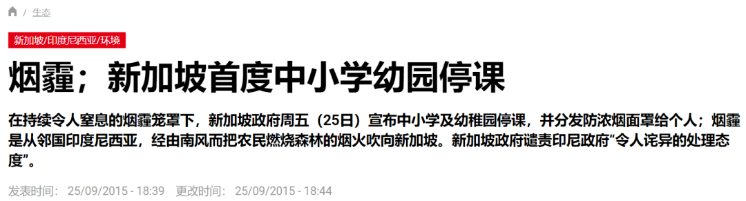 当时,受印尼大火影响新加坡遭烟霾袭城。新加坡国家环境部宣布,当天24小时空气污染指数为152。