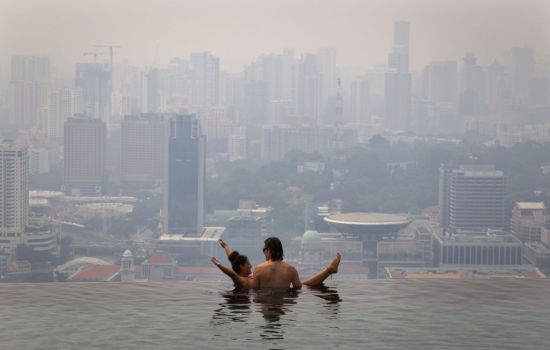 这导致整个新加坡被烟霾覆盖,从滨海湾金沙的无边泳池一眼望去,原本清晰可见的市中心建筑仿佛成了海市蜃楼一般。