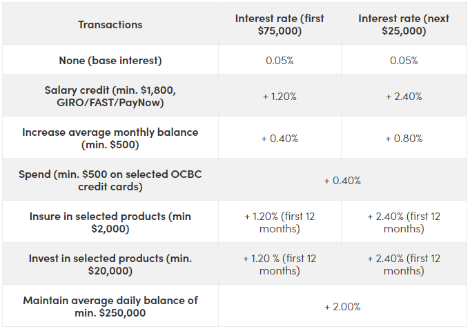 和前面几家银行相同,它的基本年利率为0.05%,然后会根据你的存入工资、信用卡消费(每月最低500新币)、余额增长、保险和投资等情况,给你提供不同的奖金。但需满足至少存入1800新币的工资是前提条件~