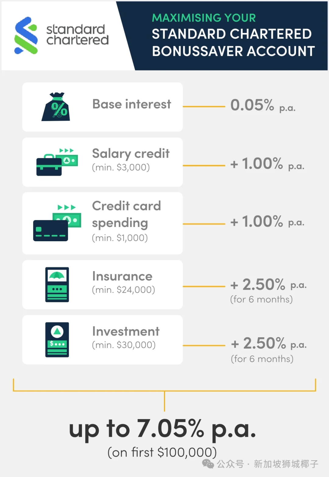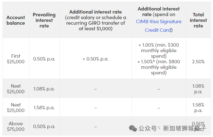这个账户的基本年利率为0.05%,然后会根据你的存入工资、信用卡消费(每月最低500新币)、余额增长、保险和投资等情况,给你提供不同的奖金。但需满足至少存入1800新币的工资是前提条件~