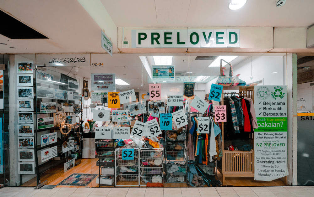 New2U Thrift Shop 由新加坡妇女组织理事会牵头,消费款用于慈善,价 2 新元起,常推促销,有试衣间,售二手服饰等,也收旧衣包配饰捐赠。
