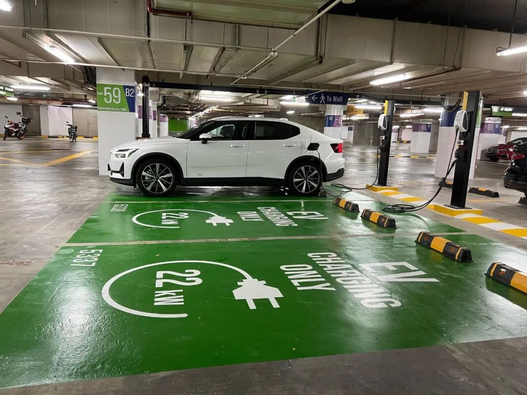 Tampines Mall设电动车位,可通过 SP 公用事业应用使用,充电器可靠、费率具竞争力,18 点后入场固定收费 2.65 新元。