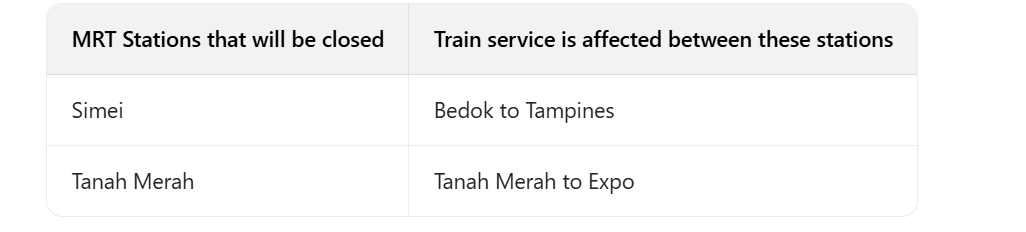 - 受影响的线路为Bedok至Tampines段及Tanah Merah至Expo段,期间将提供 7 号和 8 号接驳巴士及接驳列车、Downtown Line可作为替代选择,走此路线预计会增加约 30 分钟行程时间。