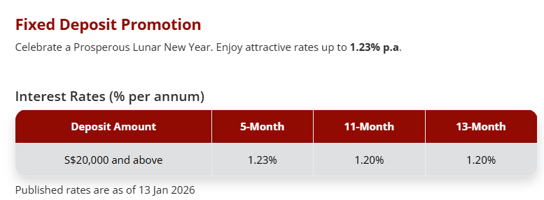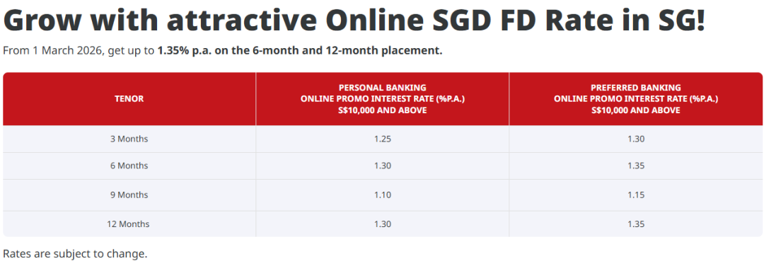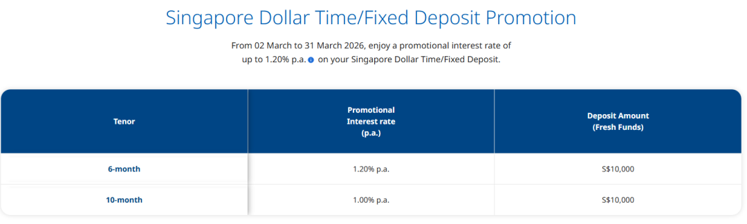 目前,该公司提供的最佳定存利率为3/6个月的1.30%。但需要注意,存入10000新币和只存1000新币,同样存期能够获得的利率有差异。