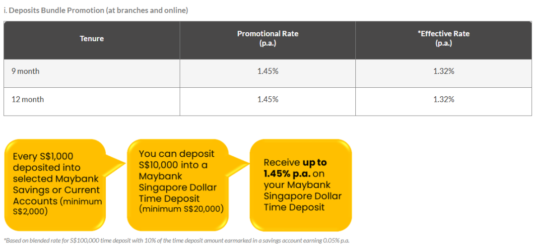 马来亚银行促销定存活动有两种选择,第一种是定存套餐,起存金额需要至少20000新币,且至少1000新币必须存入马来亚银行指定的储蓄或往来账户内:优惠利率为9/12个月,利率1.45%。