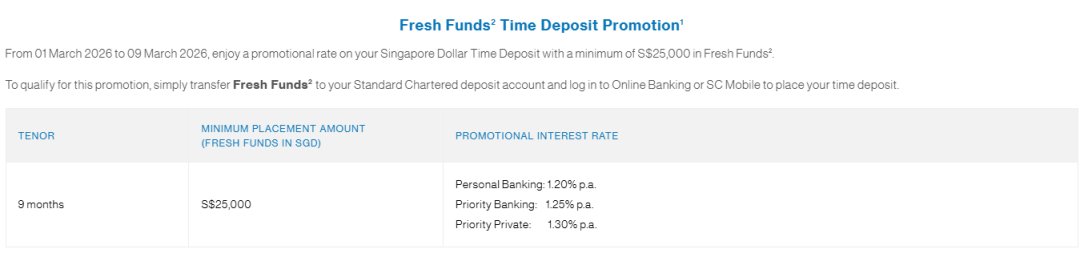 一样大降0.25-0.35%!渣打银行现在提供促销定存利率,存入至少25000新币,9个月优惠利率为1.20%-1.30%!