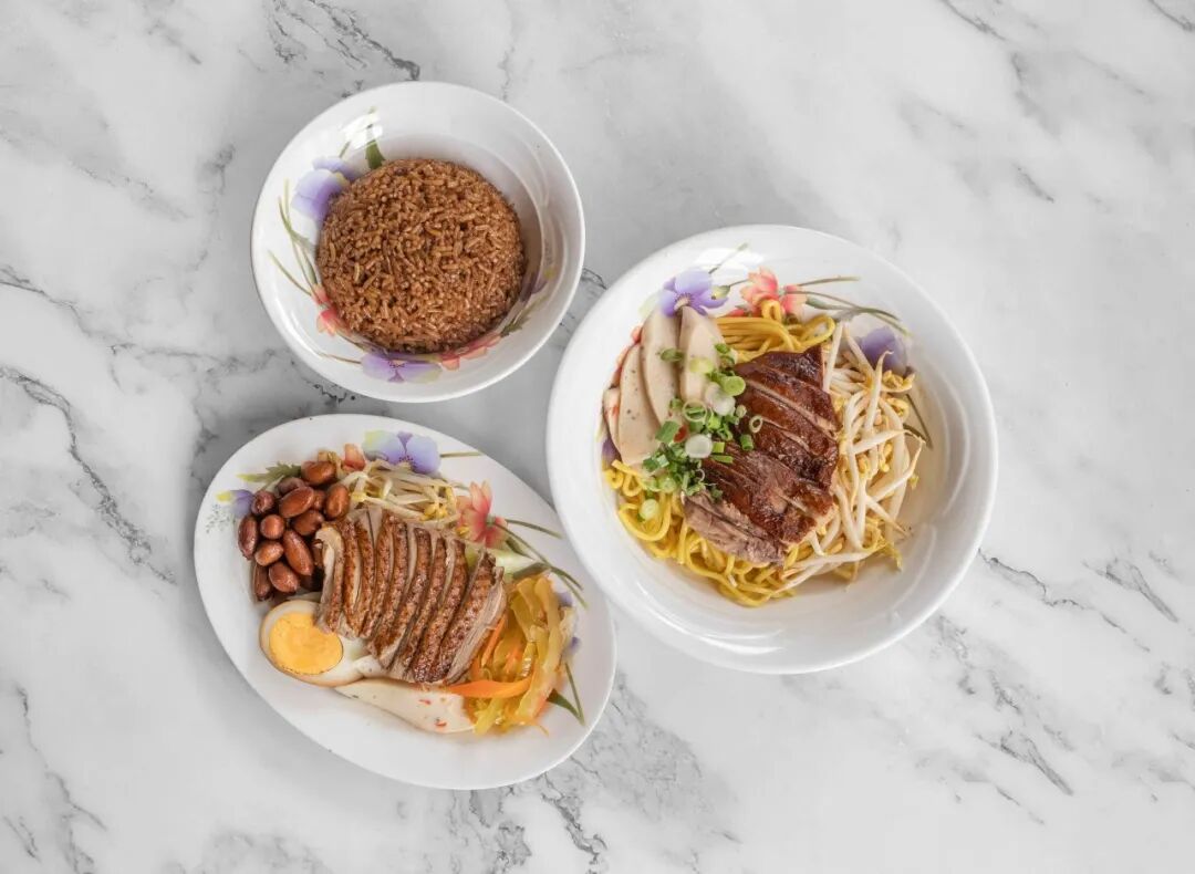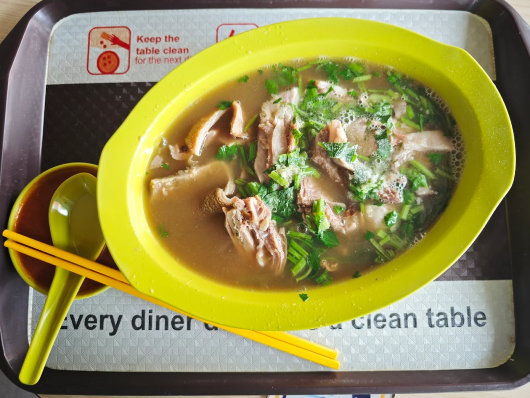 武吉美拉熟食中心的 Happy Duck,主打嫩红烧鸭,闽南鸭面等主食 3.5 新元起,份量足,4.3 新元的粿汁套餐含肉汤、粿条及多样食材,性价比高。