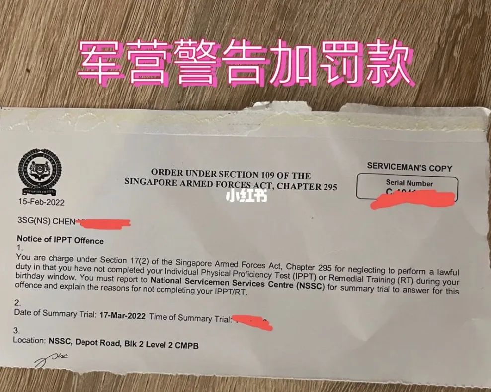 今年,有人收到新加坡军营开出的警告信跟罚款单,因为没能按时体能检测,罚款50新~