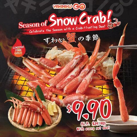 海鲜爱好者注意!Yakiniku-GO 即日起至 2026 年 3 月 3 日推雪蟹促销,点任意套餐即享 300g Suwaigani(9.90 新元),单点 29.90 新元。