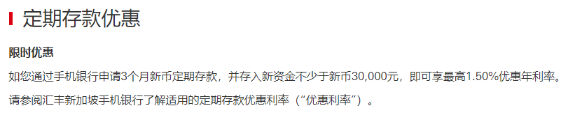 汇丰银行尊享用户,可以享受到3个月1.50%的最佳定存利率。但需要至少存入30000新币,且只能通过手机银行存入!