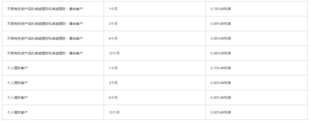 如果不满足以上条件,个人用户目前最佳定存利率只有:3、6、12个月的0.80%。