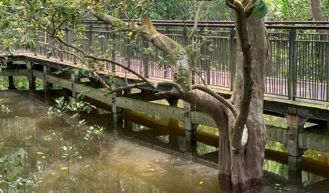 Mangrove Boardwalk 的 3km 长线能深入红树林核心区,看到弹涂鱼、招潮蟹的栖息洞穴。