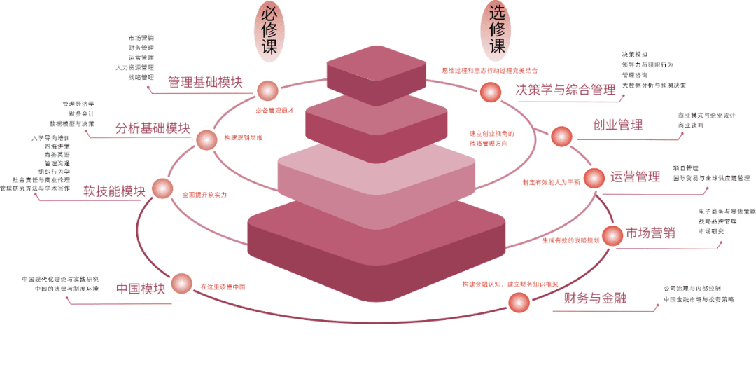 分为“管理基础模块”、“分析基础模块”、“软技能模块”与“中国模块”四大模块,帮助学生从四个主要维度,奠定坚实的企业管理知识、理论与技能基础。