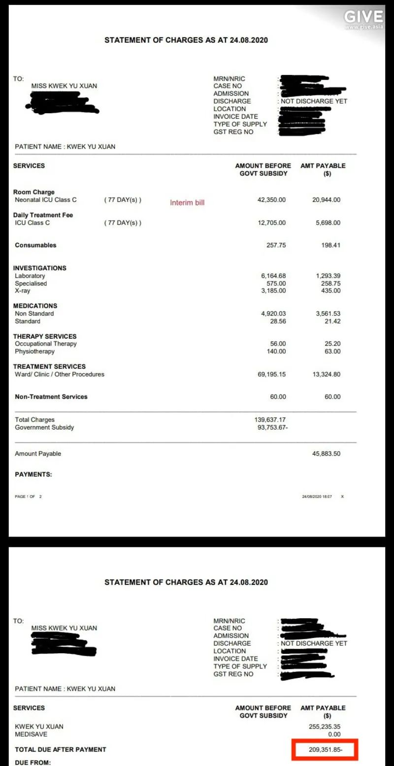 玉媗在国大医院的新生儿重症监护室(NICU)期间,做了不同的检查和治疗,医药费相当惊人,约为 230,000 新元。