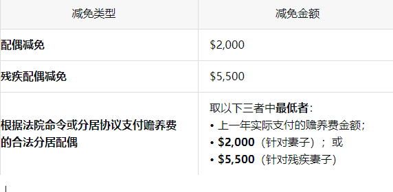 如果你与配偶合法分居,且根据法院命令或分居协议支付了赡养费,你仍然可以申请此项减免。但向前配偶支付赡养费的已离婚纳税人,不符合申请此项减免的资格,税收减免的标准如下: