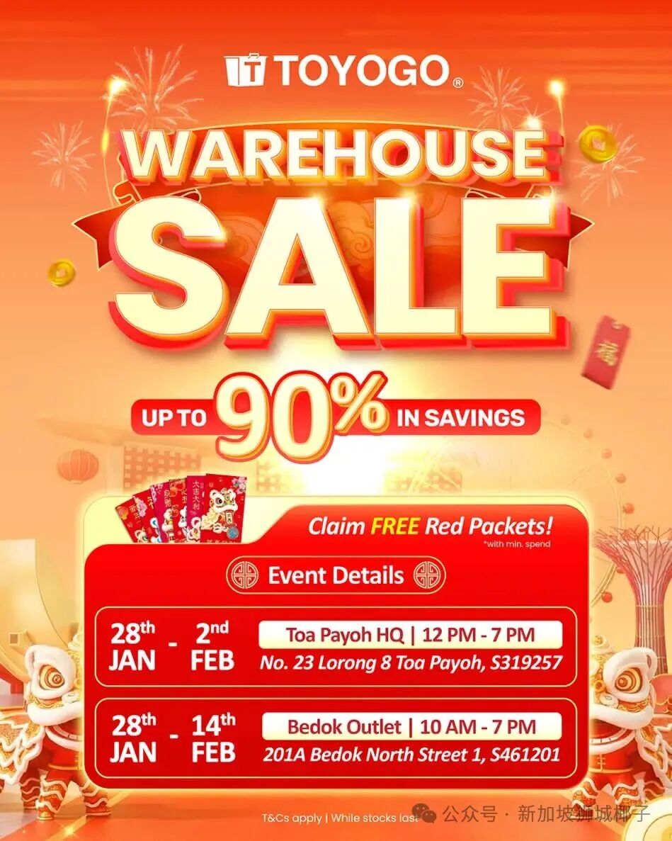 2026 年 1 月 28 日至 2 月 14 日,新加坡 Toyogo 举办新春仓库特卖,家居收纳好物低至 1 折,售价从 1 新元起,满 30 新元还可领免费红包。