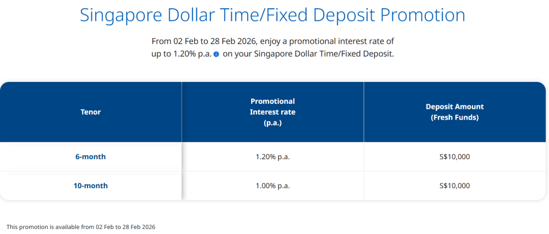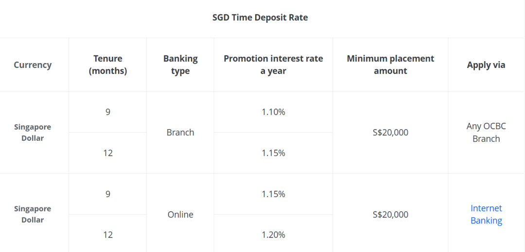 目前,该公司提供的最佳定存利率为3/6个月的1.30%。但需要注意,存入10000新币和只存1000新币,同样存期能够获得的利率有差异。