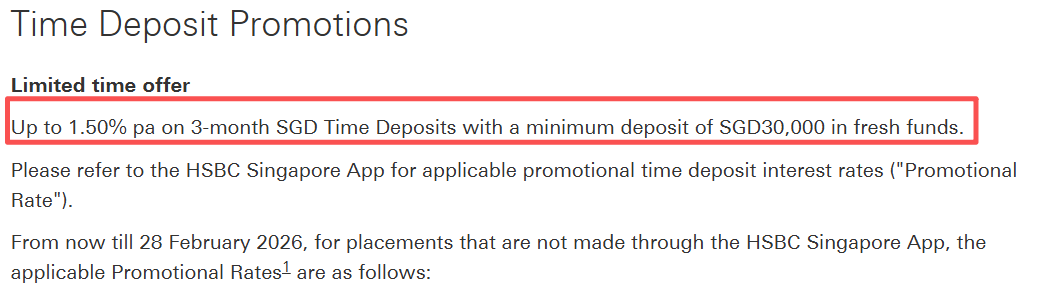 汇丰银行尊享用户,可以享受到3个月1.50%的最佳定存利率。但需要至少存入30000新币,且只能通过手机银行存入!(其他存入方式均无法享受)