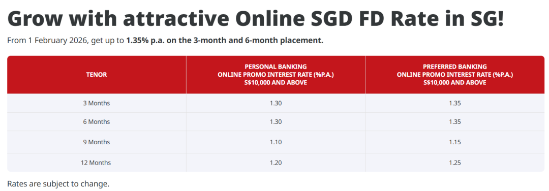 如果是更高端的preferred banking,利率会涨到1.35%。但需要注意,不管哪种存款模式,都需要通过电子银行存款至少1万新币才能享受利率优惠。