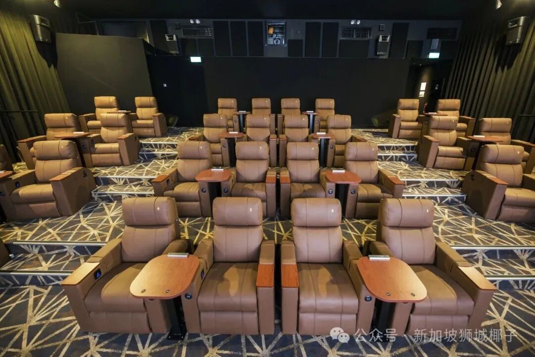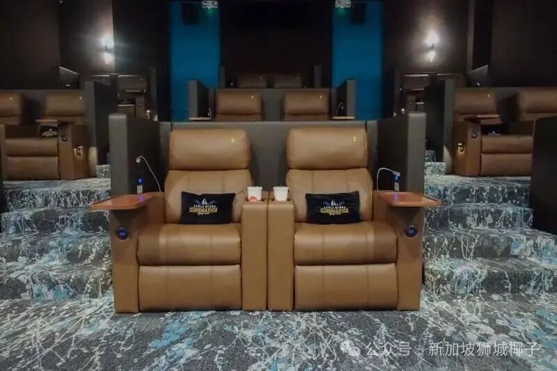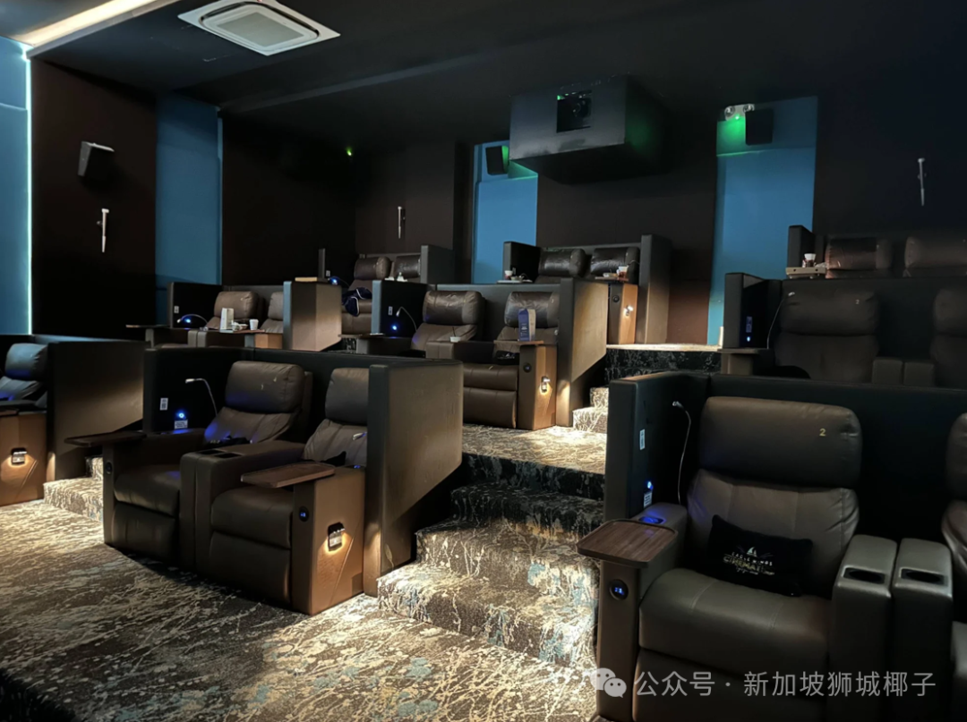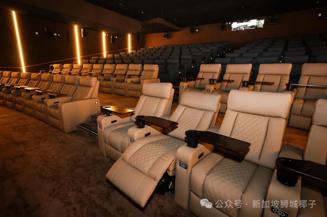 工作日票价 25 新元起,影厅里是皮质躺椅,还配有边桌和充电口,门票里还包含 7 新元的零食积分,特别贴心。