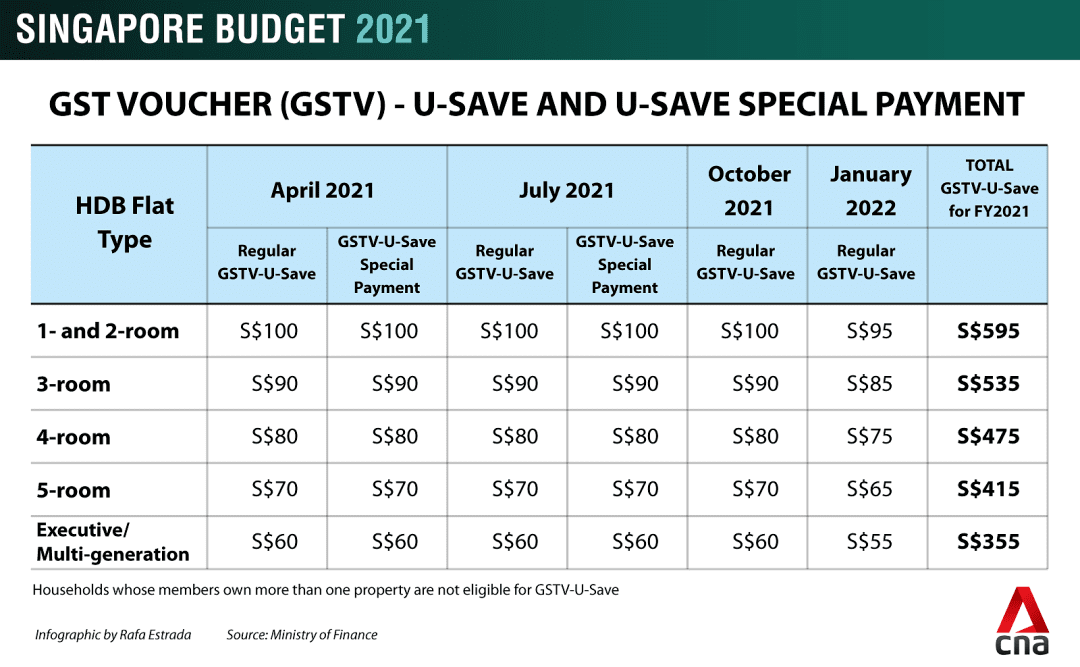 住在一房和两房式组屋的家庭通常会收到消费税券GSTV U-Save的回扣,平均约为三至四个月的水电费。