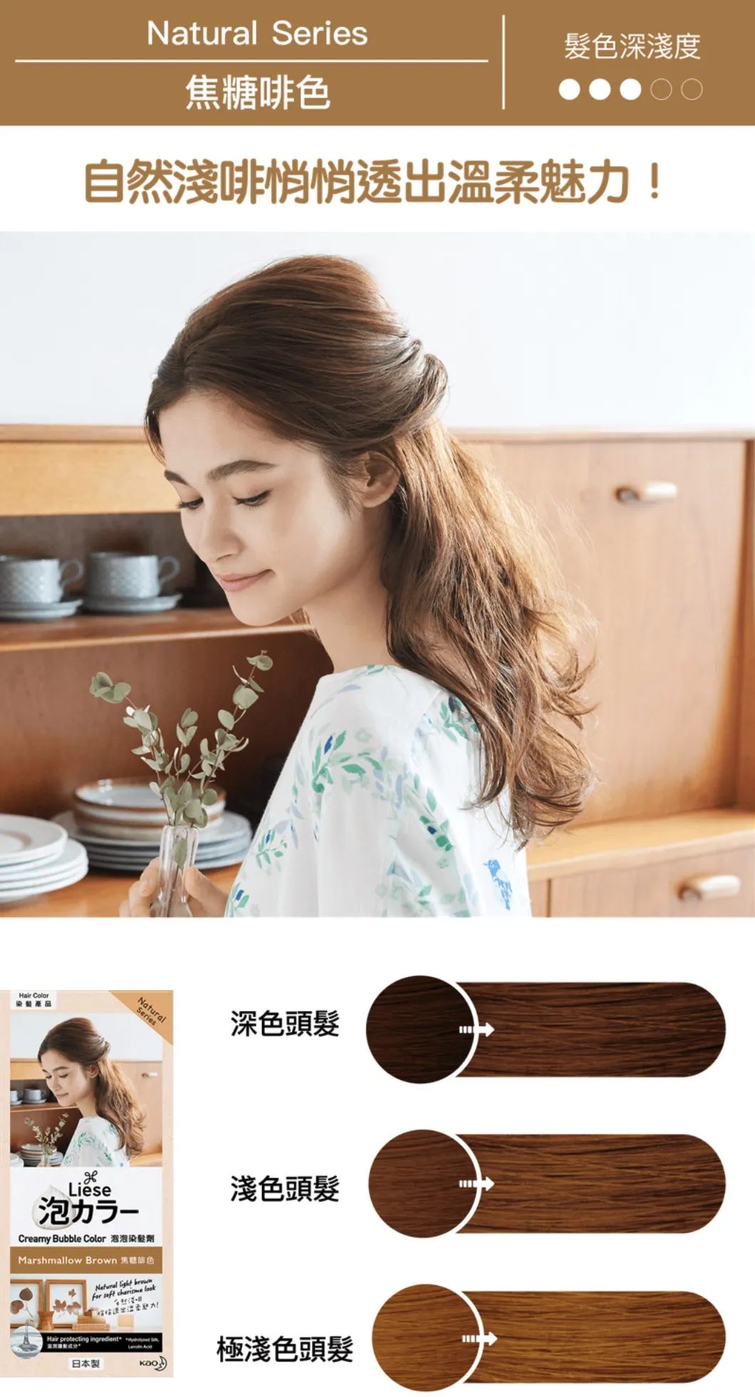 不管发质如何,头发是长是短、是卷是直,花王染发剂让你遇见更美的自己!家里操作即可,步骤到位、用量到位,可达到美发店上百元效果!