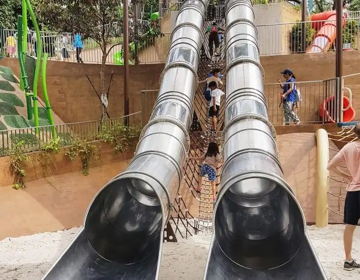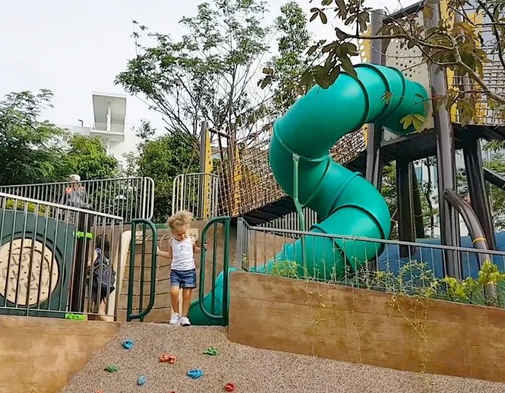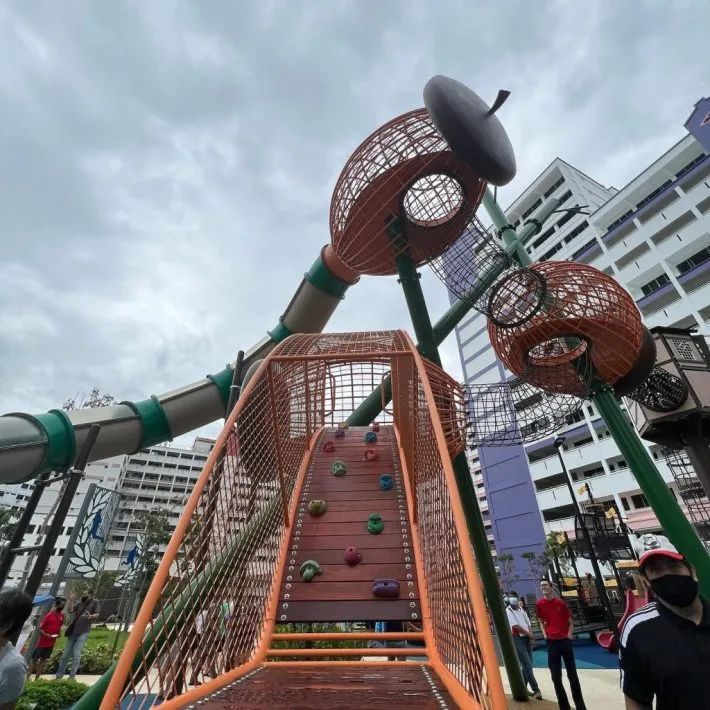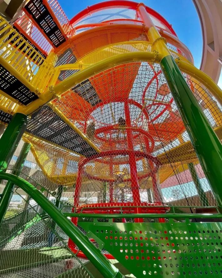 游乐场约3米高,设有巨大滑梯、桥梁和攀爬网,附近还有两个户外游乐场和兀兰美食广场,适合上学的中小学生玩耍~