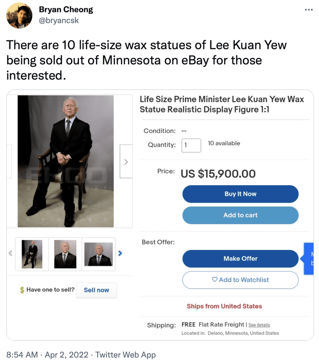 而在国外,似乎李光耀也有着相当旺的人气。eBay的一个零售商,在其商铺中国摆上了李光耀真人大小的蜡像,每个报价15900美金。