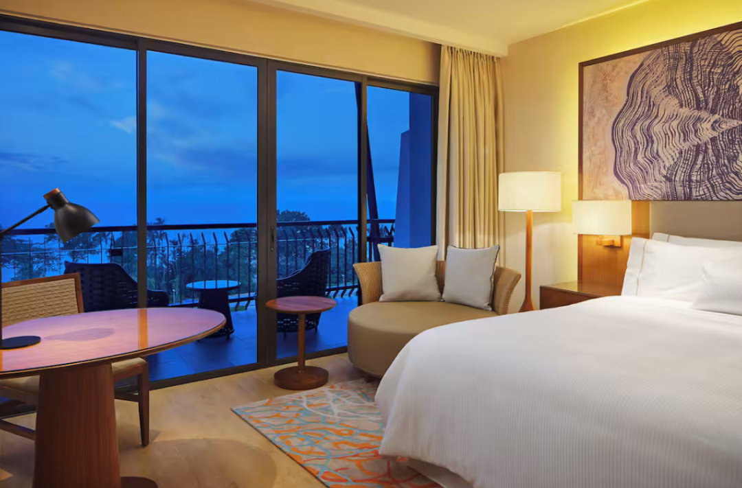 Hard Rock Hotel Desaru Coast 房型多样,从舒适高级房(162.35 新元起)到摇滚明星套房(542.82 新元 / 晚起),均具热带氛围且阳台可见水上乐园。