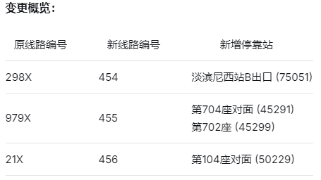 为优化公交网络,并与上文提及的新支线巴士451至453路协同服务,原298X、979X及21X路巴士已分别重新编号为454、455和456路。每条线路将在沿途增设1至2个巴士站,以增强区域连通性。除此之外,线路其余部分、票价及运营时间均保持不变。
