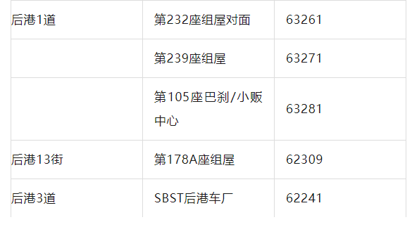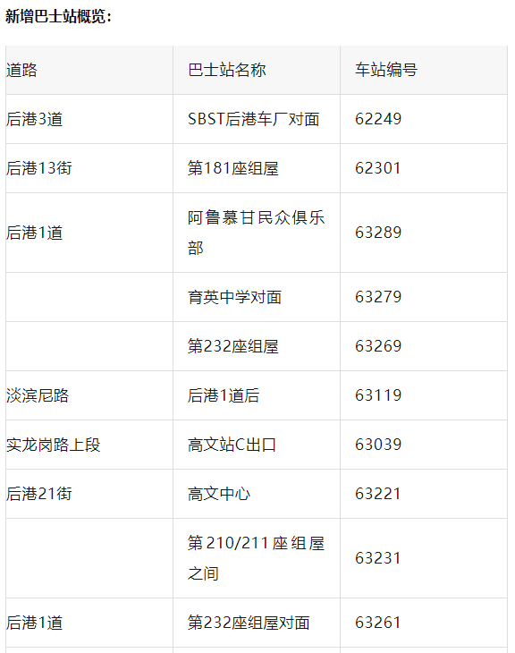 新路线还在后港21街增设了两个巴士站——位于第210座与第211座组屋之间(站台编号63231)以及第211座组屋对面(站台编号63239)。