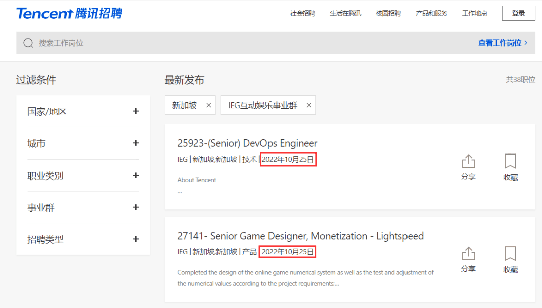 在新加坡,腾讯开启的38个相关岗位招聘,包括3D模型工程师、游戏数据分析师等等,而且,有一半工作,都是在上个月才挂上网的新招聘!
