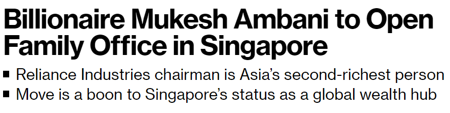 今年10月,据《彭博社》报道,福布斯亚洲财富榜排名第二的印度超级富豪——穆克什·安巴尼(Mukesh Ambani),将在新加坡开设家族办公室。