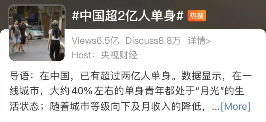最近中国接连两条新闻上了热搜,昨天是#中国超2亿人单身#,今天是#专家称放开生育越早越好#!