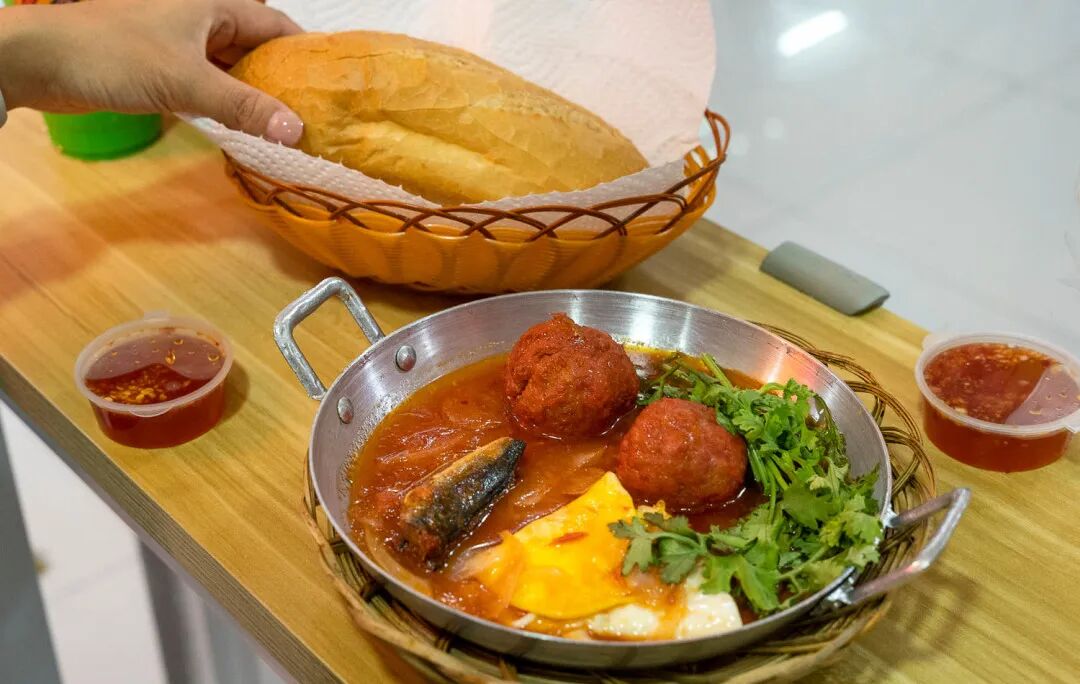 正宗越南风味必试 Banh Mi Chao(12 新元),热锅盛载番茄酱底配蛋、沙丁鱼等,搭酥脆法棍、还有Roasted Pork、Fried Fish Cake (8.90-9.90 新元),及多款米饭、面条菜肴可选。