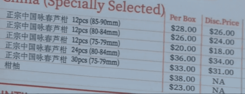 30至36个装的潮州焦柑的价格每箱介于19.9到28新币