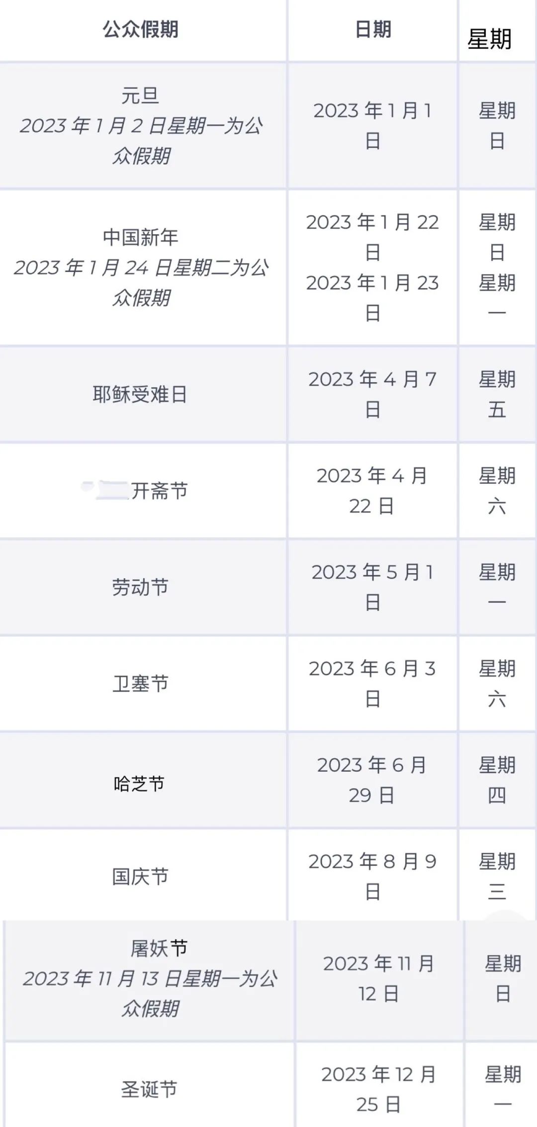 以下表格就是,2023年的长周末和公共假期的时间: