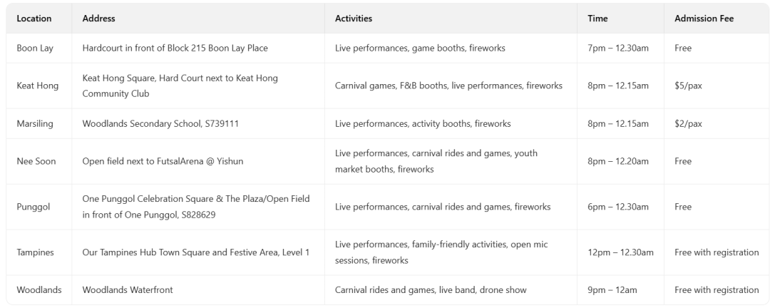 - 新加坡 ONE 2026 倒计时庆祝活动将在全岛多地举办,核心地点包括滨海湾、体育城、圣淘沙、克拉码头(各有专属主题),另有七个社区地点及移民工友娱乐中心、宿舍同步参与。