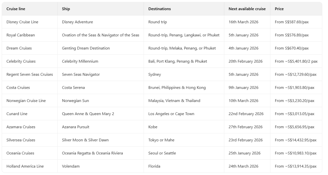 - 新加坡2026年的邮轮行经过精心策划,提供各种旅行选择,迎合不同群体的需求,无论是短期休假还是长途旅行。