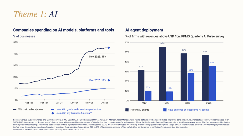 AI应用已进入可衡量阶段。目前约有9-10% 的美国企业已将AI嵌入生产流程,而40-45% 的企业正在为AI模型或平台付费。早期采用者报告在软件开发、客户服务和物流等领域实现了5-15% 的生产力提升。