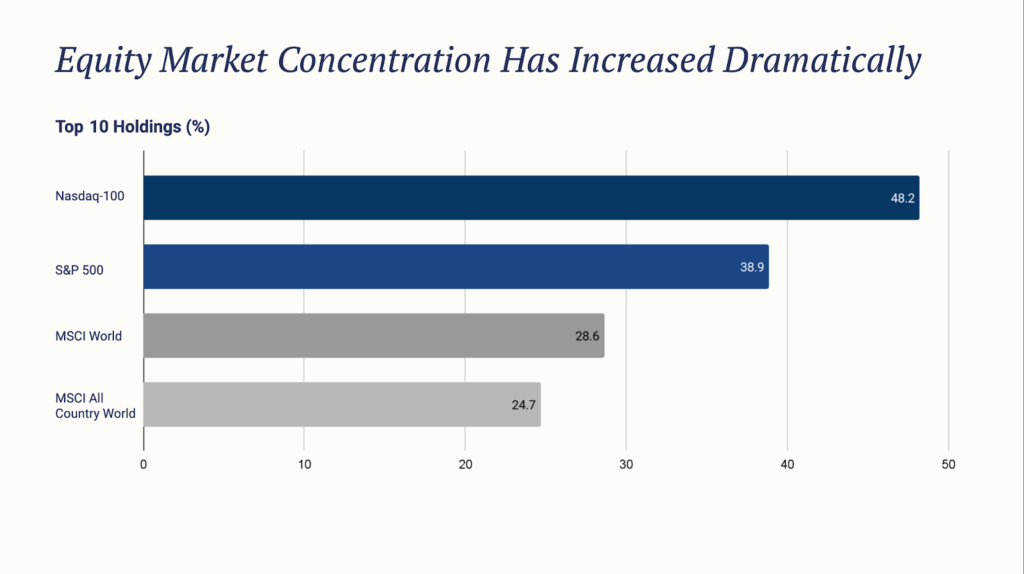 可以观察到的现象是,目前市场结构已发生重大变化:美股前十大公司约占标普500市值的40%,这一水平在历史上往往与更高的回报分化和更低的估值容错率相关联。