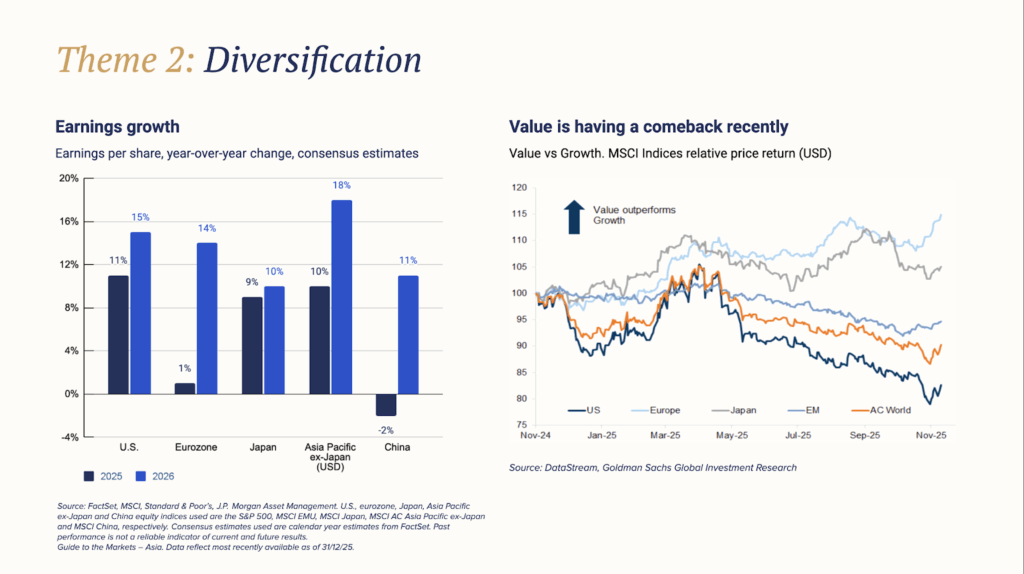 关键在于,盈利广度已有所改善。2025年,盈利上调已从少数美国巨头公司扩展到欧洲、日本和部分新兴市场,这得益于更严格的成本控制、稳健的利润率以及更有利于股东的资本配置。随着成长股面临估值考验而价值股显现复苏迹象,因子强度开始显现。