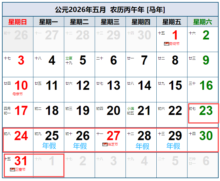 明年的哈芝节(暂定日期)和卫塞节相隔很近,只要在5月25日、26日、28日和29日拿四天年假,就能一口气休息10天!(6月1日为卫塞节补假)