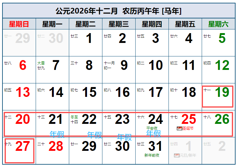 12月25日是星期五,你也可以什么也不做就享受三天假期。但如果年假还有剩,何不在12月21-24日拿上四天年假,让自己好好休息会,给自己的2026年画上一个完美的句号呢?