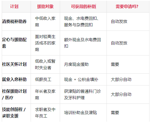 ①临时援助:为低收入个人或家庭提供紧急、短期的经济援助。财务援助包括现金援助和超市购物券两类,当局会根据个人财务状况给予分配。