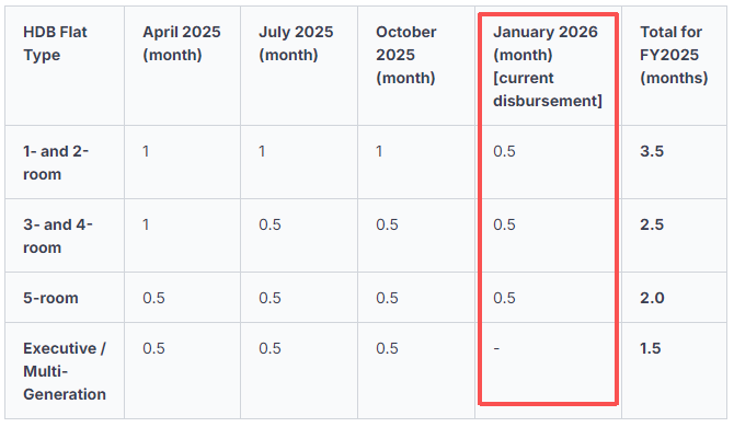 水电费和杂费回扣:将计入符合条件的组屋住户的水电费账户。2026年1月,符合条件的家庭将根据其组屋类型获得最高190新元的水电费回扣。符合条件的家庭还将在1月根据其组屋类型获得最多0.5个月的服务与杂费回扣