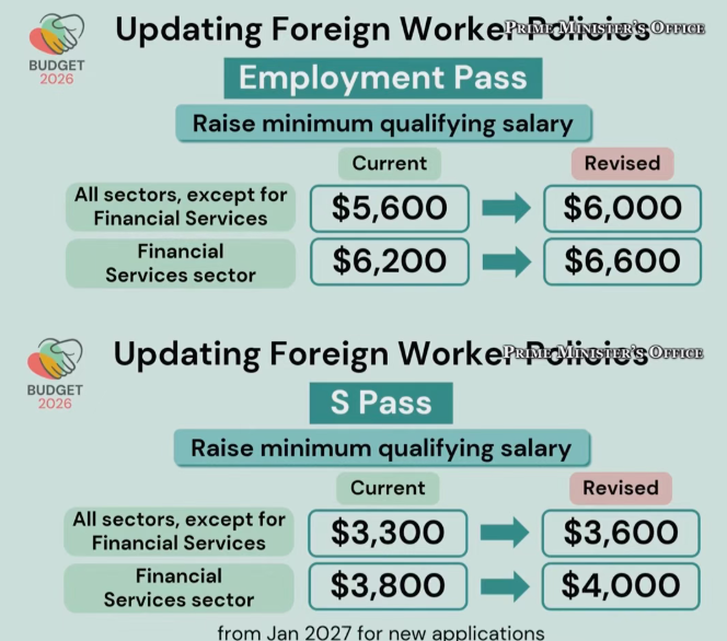 从2027年1月1日起,EP最低月薪从5600新元调到6000新元(金融行业从6200调至6600新元);S Pass从3300调到3600新元(金融行业从3800调至4000新元)