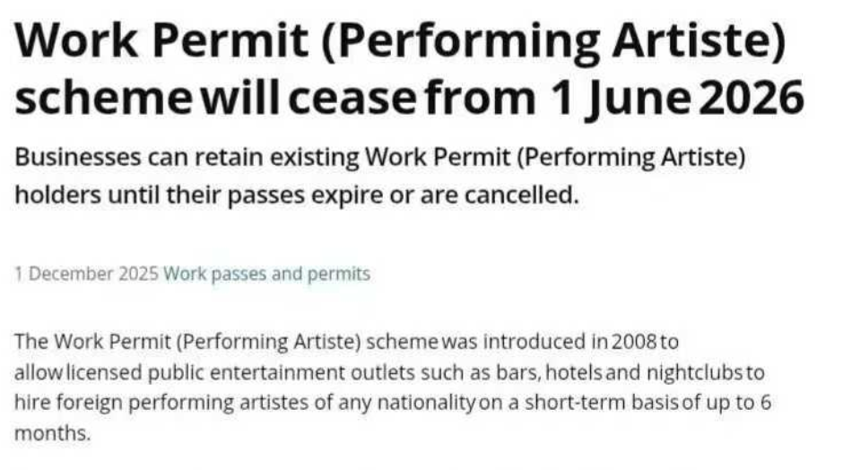 从2026年6月1日 起,MOM将不再接受 Performing Artiste Work Permit 新申请。这是一个重要信号:
